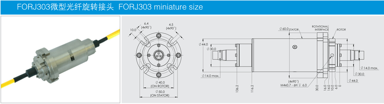 FORJ303光纖旋轉(zhuǎn)接頭用于單?;蚨嗄O到y(tǒng)的光電旋轉(zhuǎn)連接;完全的雙向旋轉(zhuǎn);與現(xiàn)有的電氣滑環(huán)設(shè)計相融合;全封閉結(jié)構(gòu);能為客戶量身定制所需要的光纖滑環(huán)