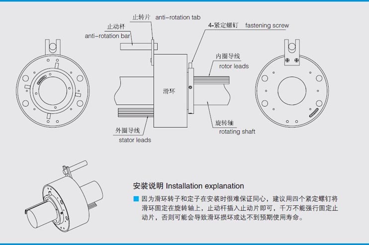 ■ 在滑環(huán)安裝時,務(wù)必要保護好導(dǎo)線,避免因?qū)w絕緣層損壞而影響產(chǎn)品品質(zhì)